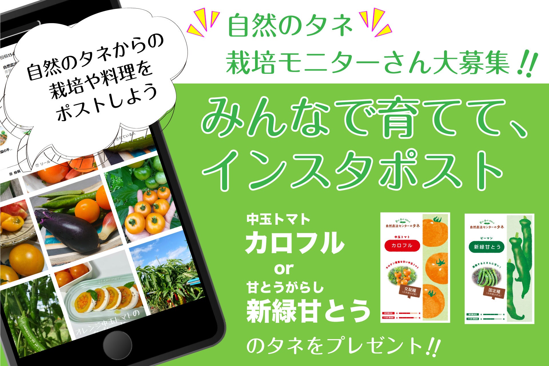 タネから野菜を栽培する様子をインスタグラムに投稿下さる方には人気のオレンジトマト「カロフル」と甘とうがらし「新緑甘とう」のタネをプレゼントします。