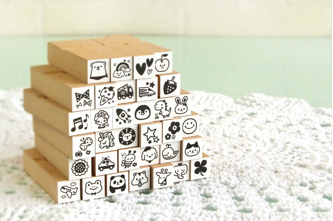 イラストスタンプは、すべて当店作成のオリジナル。文字の読めない0歳〜3歳のお子さまには“マイマーク”として認識してもらいやすいのでお名前の横に一緒にスタンプするのもオススメです。