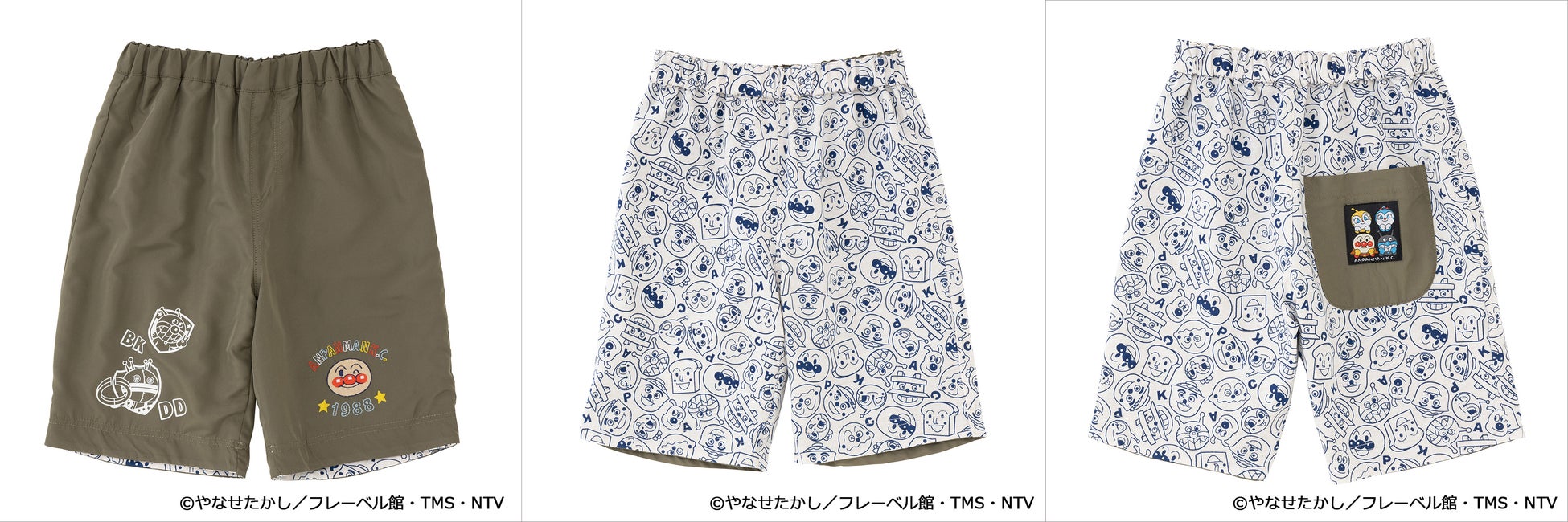 表面はアンパンマンの刺繍、ばいきんまんとだだんだんのプリントでデザイン。裏面はアンパンマンやばいきんまん、どんぶりまんトリオなどたくさんのなかまたちがプリントされた総柄デザインです。シーンに合わせてコーディネートを楽しめます。