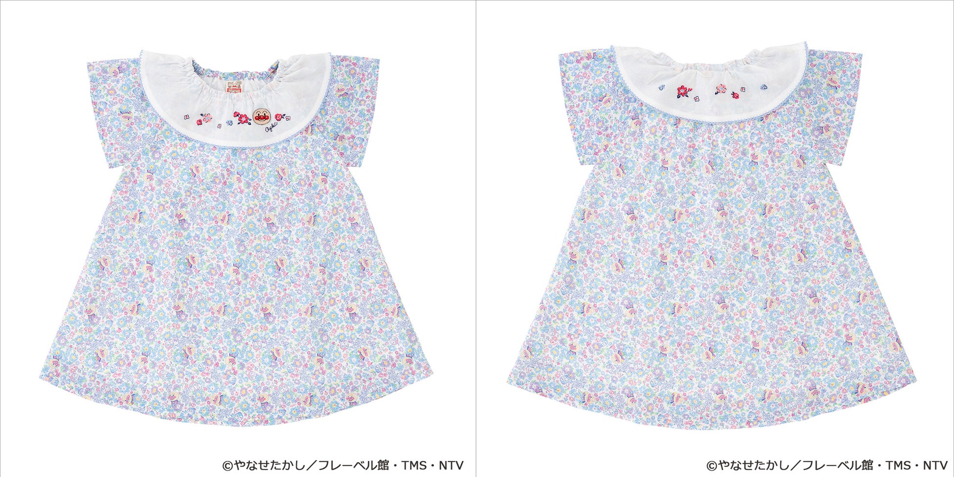 小花と一緒に、アンパンマンやドキンちゃん、コキンちゃんを総柄でデザイン。首元にゴムを入れており、クシュっと愛らしいシルエットにしつつ、お着替えもしやすいデザインと仕様です。フェミニンなピンクとおしゃれなサックスブルーの2色展開。裏地付きなのもうれしいポイント。