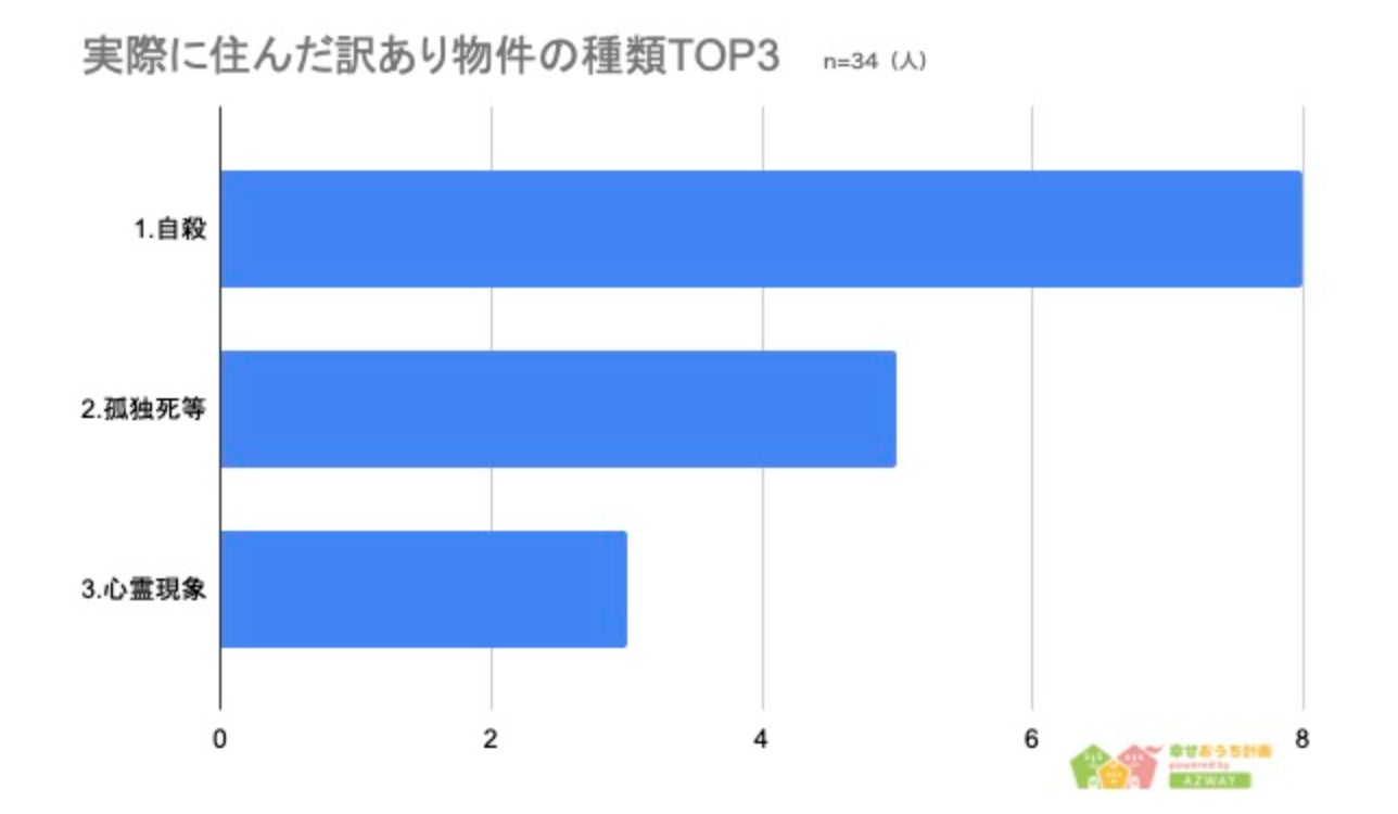 また、訳あり物件に実際に住んだことのある人に「訳ありの種類」を聞いたところ、「自殺」が1位で8人、「孤独死等」が2位で5人、「心霊現象」が3位で3人という結果に。訳あり物件の種類は、前の住人が死んでいる「事故物件」が多いことがわかります。一方で、「カビや油汚れがひどい」や「事故が起こりやすい立地」、「隣人トラブル」、「線路が近い」など他にも様々な理由が挙げられており、訳あり物件と言っても他にもいろいろな理由があることがわかりました。