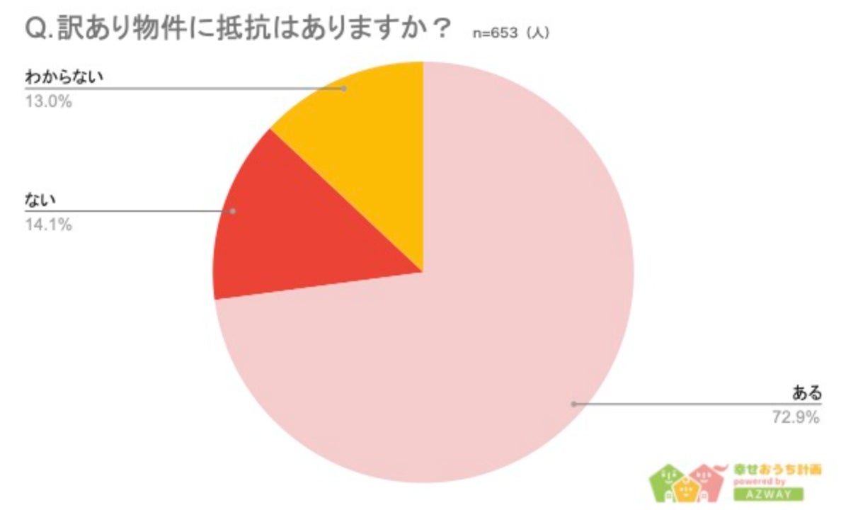 また、「訳あり物件に抵抗があるか」について聞いたところ、「ある」が476人(72.9%)、「ない」が92人(14.1%)、「わからない」が85人(13%)という結果に。訳あり物件に抵抗がある人が7割を超えており、訳あり物件に興味はあるものの、抵抗もある人が一定数いることがわかります。