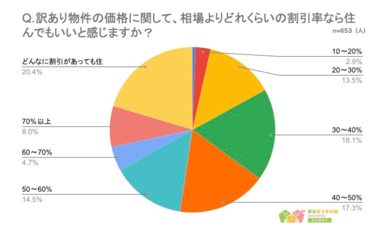 今回不動産メディア「幸せおうち計画」を運営する、株式会社AZWAY(本社:東京都豊島区、代表取締役:井口梓美)は、10代から60代以上までの653人を対象に「訳あり物件がいくらだったら住んでもいいか」についてアンケートを実施しました。