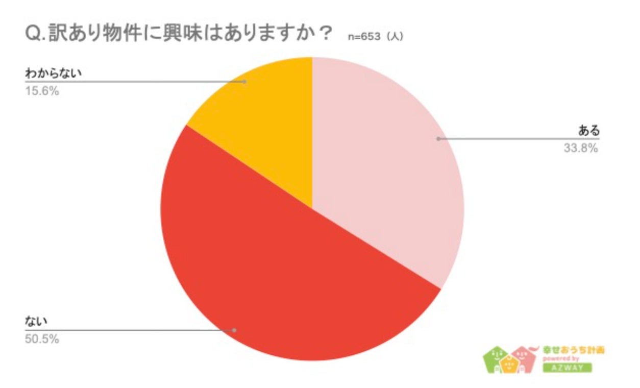 10代から60代以上までの回答者653人に「訳あり物件に興味はあるか」について聞いたところ、「ある」と答えた人が221人(33.8%)、「ない」と答えた人が330人(50.5%)、「わからない」と答えた人が102人(15.6%)という結果になりました。3割以上の人が、訳あり物件に興味を持っていることがわかります。